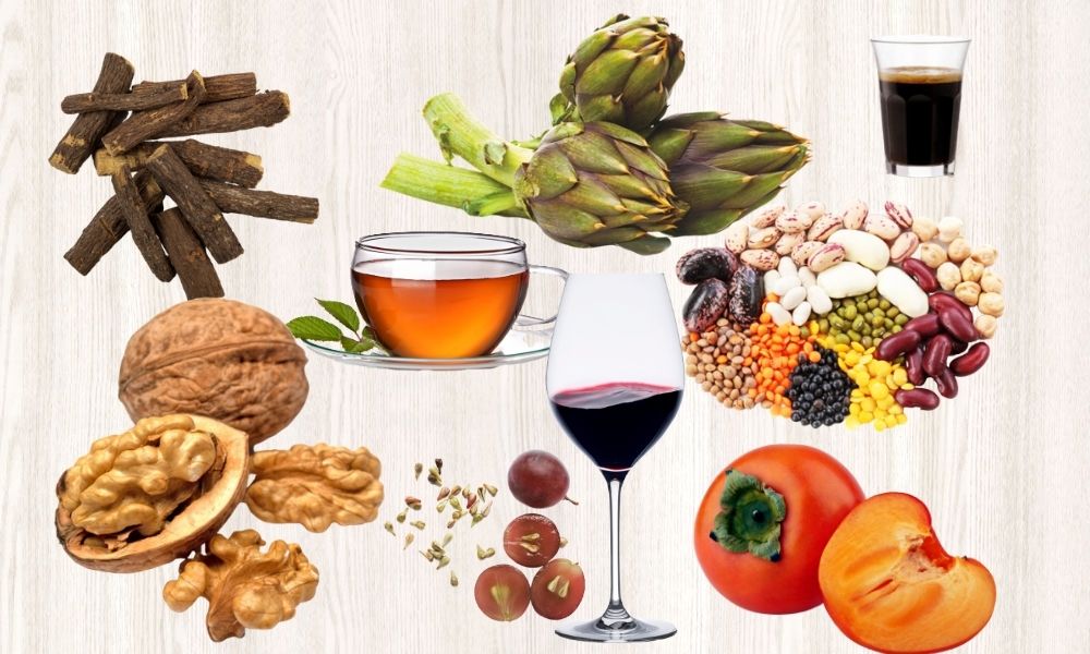 Tra i cibi che contengono i tannini ci sono per esempio nel caffè, tè (specialmente verde), cacao, liquirizia, carciofi, cachi, fragole, noci, arachidi, mandorle, castagne, legumi, succhi di frutta, birra e, come già anticipato, nell’uva.