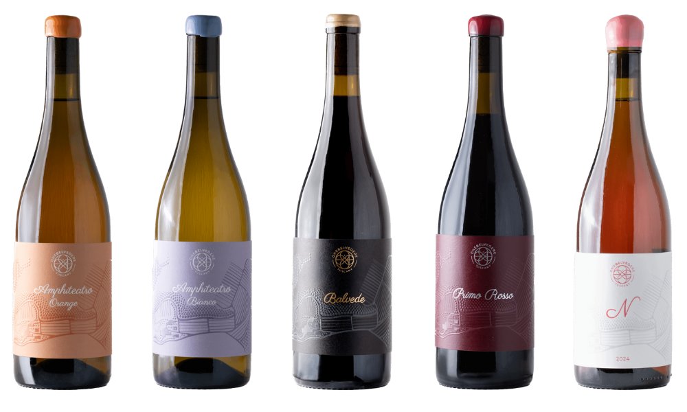 On the white and orange wine side, Amphiteatro Bianco ferments in concrete tanks with a short maceration, delivering floral and citrus notes, along with freshness and minerality. Amphiteatro Orange, vinified with skin contact and aged in barrique, is more complex, featuring delicate tannins and aromas of dried fruit.