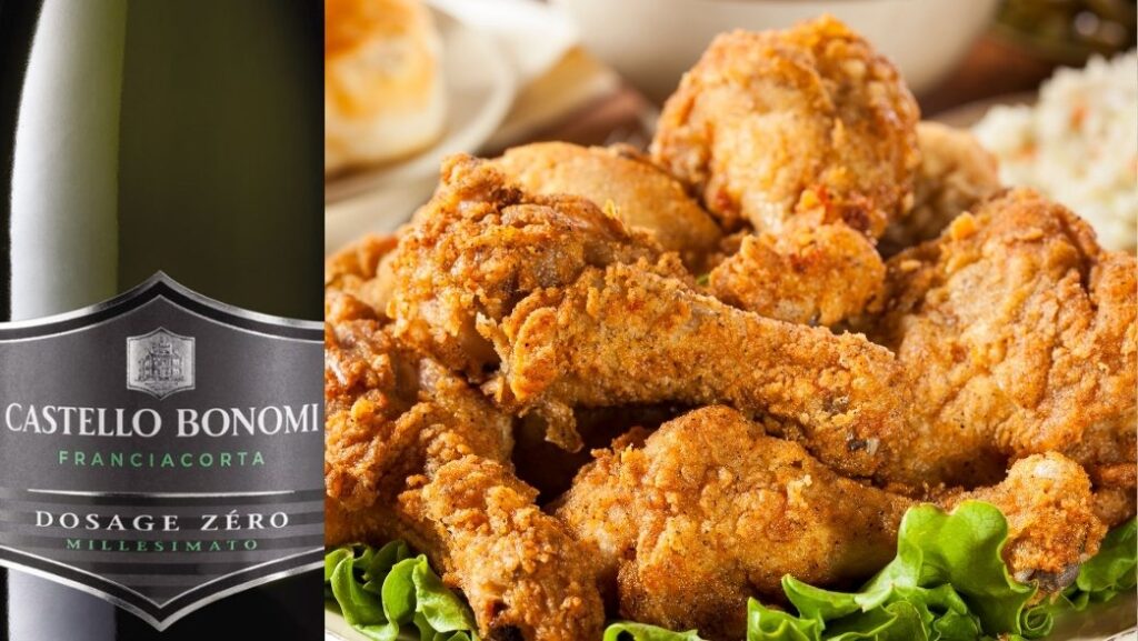 The sensational freshness and effervescence of the traditional Franciacorta sparkling wine is a perfect match to harmonize the fatty greasiness of Fried Chicken. Try this Fried Chicken wine pairing also with Champagne.