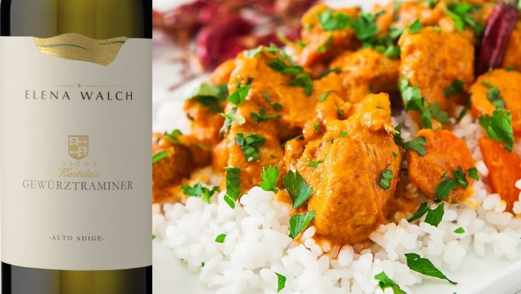 La sensazionale freschezza e l’aromaticità del Gewürztraminer si abbina in modo perfetto per armonizzare le spezie intense del Pollo al Curry.