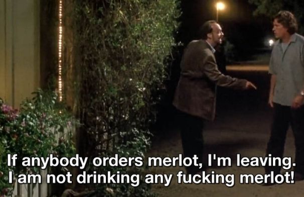 Punto di forza e tallone d’Achille allo stesso tempo, la morbidezza del vino Merlot viene spesso esasperata fino all’estremo, alimentandone la fama di vino ruffiano e monocorde, motivo per cui è stato citato sprezzantemente e ironicamente nel film Sideways nelle celebre frase -No, if anyone orders Merlot, I’m leaving. I am NOT drinking any fucking Merlot!-.
