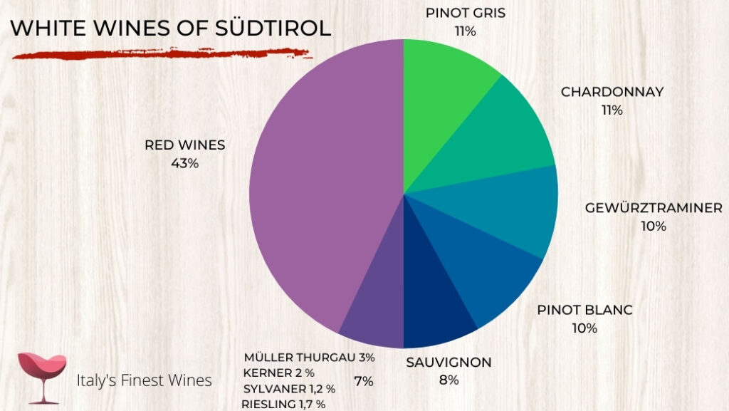 Tra i vini bianchi altoatesini da tenere in considerazione il Müller-Thurgau, che è coltivato su una superficie di circa 200 ettari in Alto Adige.